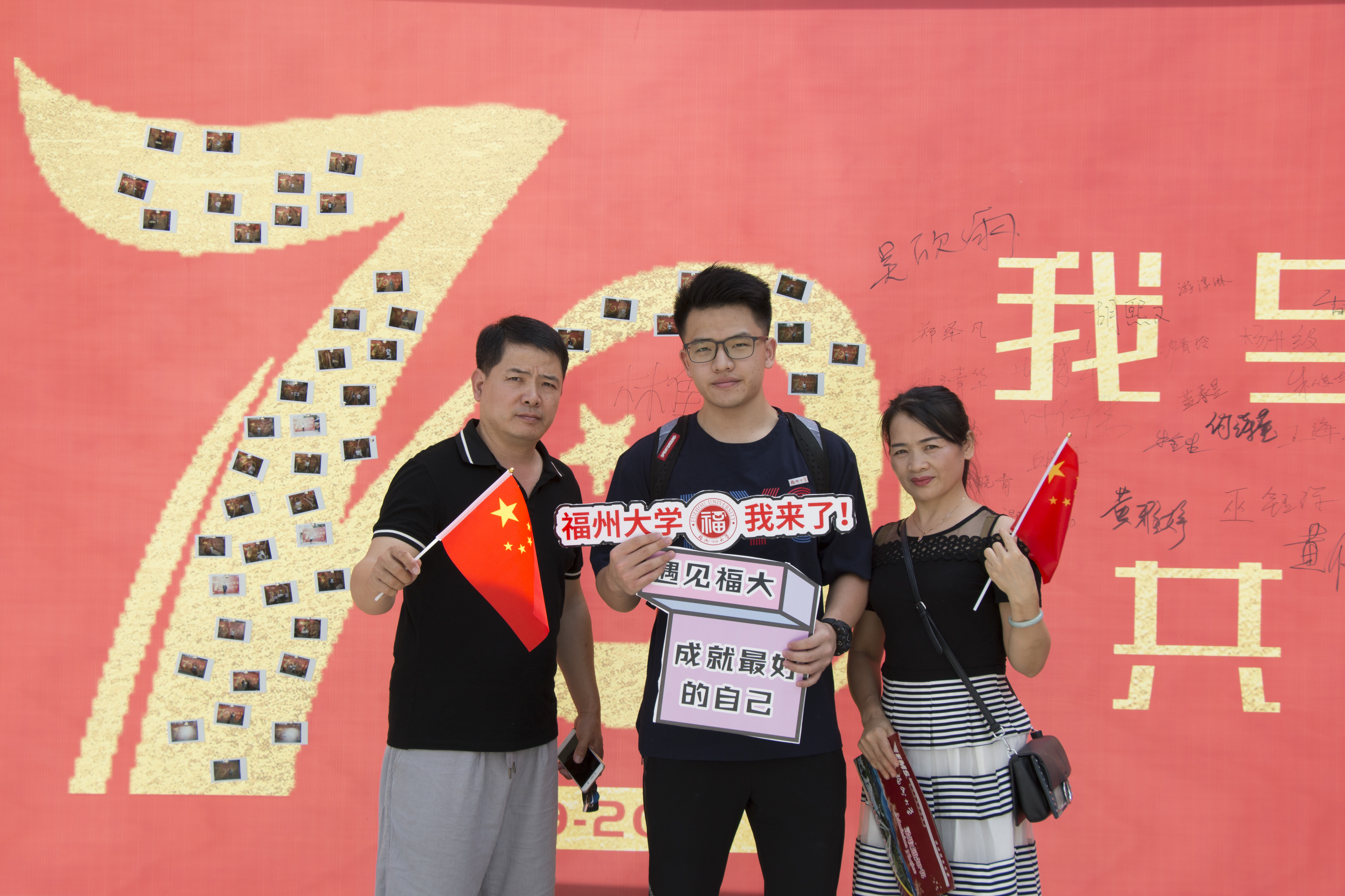 今年恰逢新中国成立70周年,德州扑克网页版 将“爱国、爱校”的元素巧妙地结合到背景墙的设计中。背景墙绘有融合五星红旗的“70”图案,并缀以“我与祖国共成长”的文字。新生在报到前的必经程序,就是与家长一起手持爱国标语KT板在背景墙前合影,此活动不仅让新生感受无声的爱国主义教育,同时也为他们留下重要时刻的剪影。