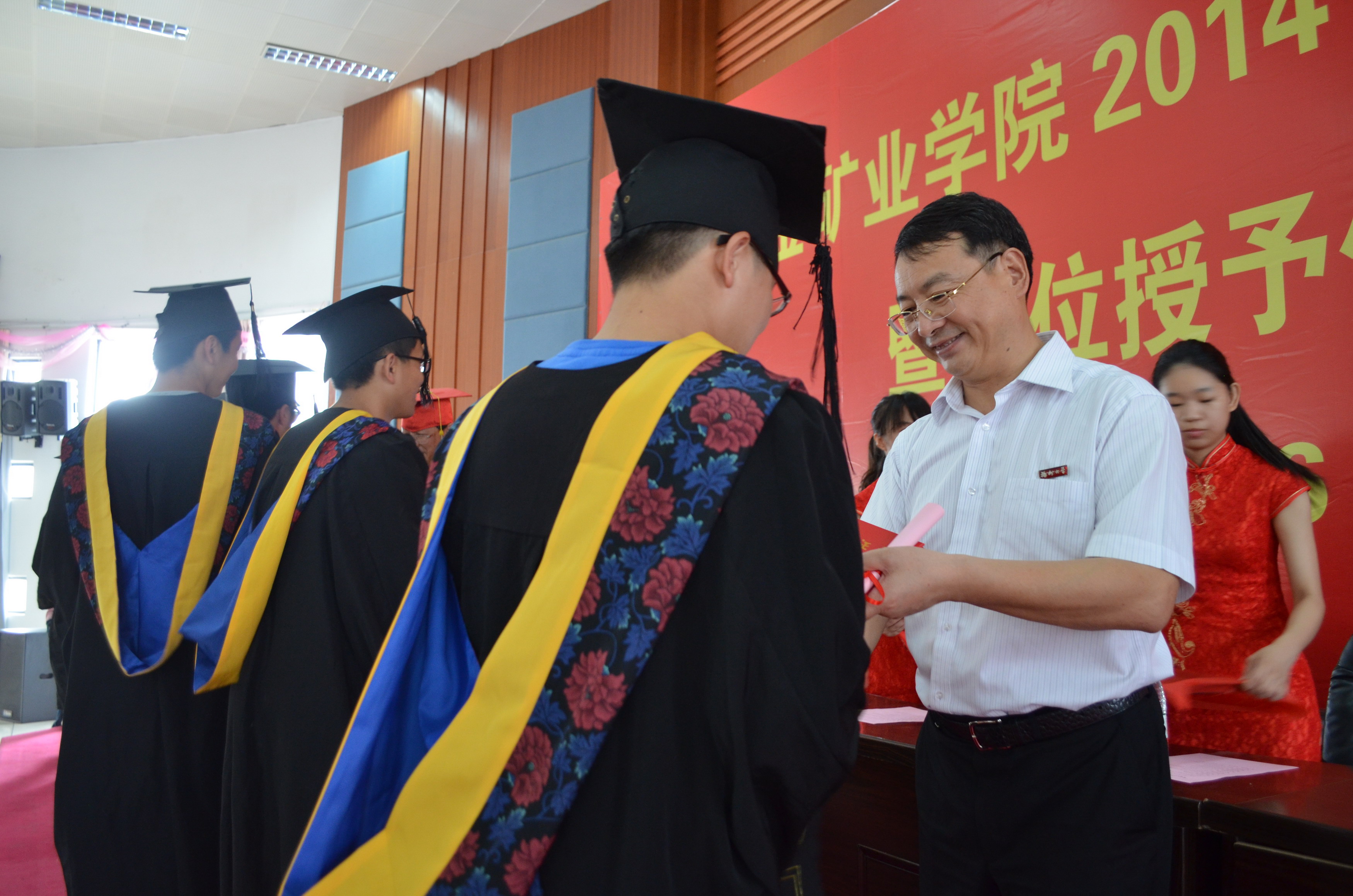 出席典礼的领导嘉宾有:紫金矿业集团股份有限公司董事长、紫金矿业德州扑克网页版 理事会理事长陈景河先生;福州大学校长助理、紫金矿业德州扑克网页版 理事会副理事长黄志刚教授;福州大学教务处处长、紫金矿业德州扑克网页版 理事会理事杨晓翔教授;紫金矿业集团人力资源部培训处处长、紫金矿业德州扑克网页版 理事会理事谢忠兰女士;紫金矿业集团董事长办公室主任邱国柱先生;德州扑克网页版 全体党政领导等。一同见证德州扑克网页版 2014届毕业生毕业盛典的还有德州扑克网页版 全体教职工、学生家长和学生代表。毕业典礼由德州扑克网页版 党委副书记余飞主持。 毕业典礼在庄严的国歌中拉开序幕。余飞副书记首先介绍了莅临毕业典礼的领导和来宾,并向他们的到来致以诚挚的谢意。随后,副院长印万忠教授宣读2014年“陈景河特优毕业生”获奖名单,陈景河董事长等德州扑克网页版 第三届全体理事会成员共同为六位获奖学生颁发证书及每人8000元奖金。 学位授予仪式是毕业典礼的“重头戏”。德州扑克网页版 教授委员会主任、副院长彭向东教授宣读了本届毕业生名单及获得学位名单。陈景河董事长、黄志刚校长助理为毕业生颁发毕业证书、学位证书,刘羽院长与彭向东副院长则逐一为获得学士学位的毕业生拨穗,与会人员以热烈的掌声对毕业生表示祝贺。 学位授予仪式结束后,福建省三好学生获得者蒋祥伟同学作为毕业生代表上台发表毕业感言,对学校、德州扑克网页版 、各位领导老师对他们的悉心栽培致以最衷心的感谢。德州扑克网页版 肖爱芳老师则代表全体教师向毕业生表达了最真挚的不舍和祝愿。刘羽院长为毕业生作了一番简短、诚挚的毕业赠言。刘羽院长说,无论学生们以后能否变成高富帅,白富美,他们的身后一直都有德州扑克网页版 全体教职工关注的目光,希望大家常回德州扑克网页版 看看。 陈景河董事长以校友、学长以及企业董事长等多重身份对毕业生们提出殷切的期望和谆谆叮嘱。陈景河董事长还为大家详细分析了矿业面临的机遇和挑战,希望走上社会的毕业生们能够以高度的责任心为自己奋斗出一片天空。毕业典礼在《勘探队员之歌》中圆满结束。(黄少钦)
